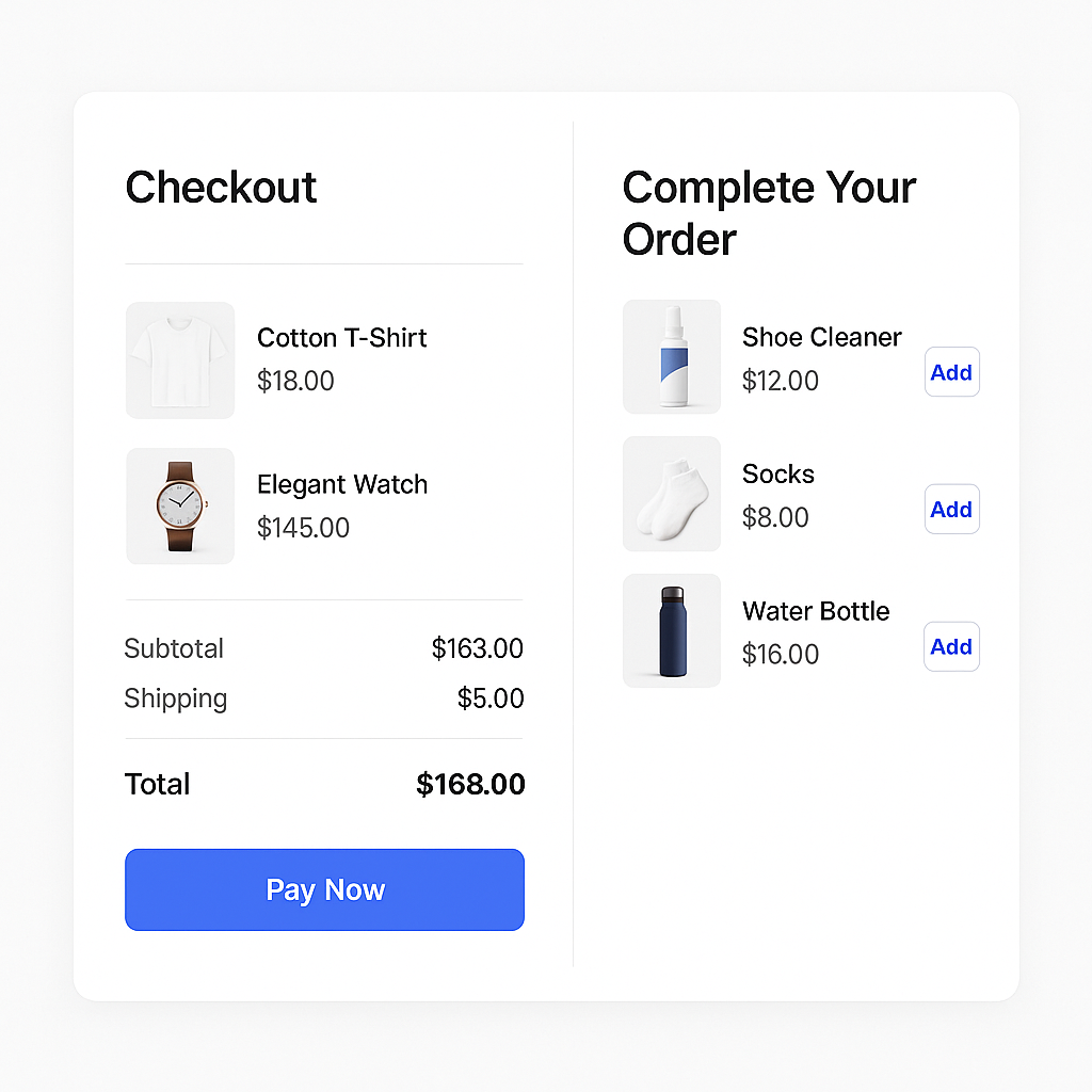 When a shopper reaches the checkout page, they’ve overcome hesitation, explored your catalog, and committed to buying. This makes checkout the safest and most effective place for upsell and cross-sell recommendations.